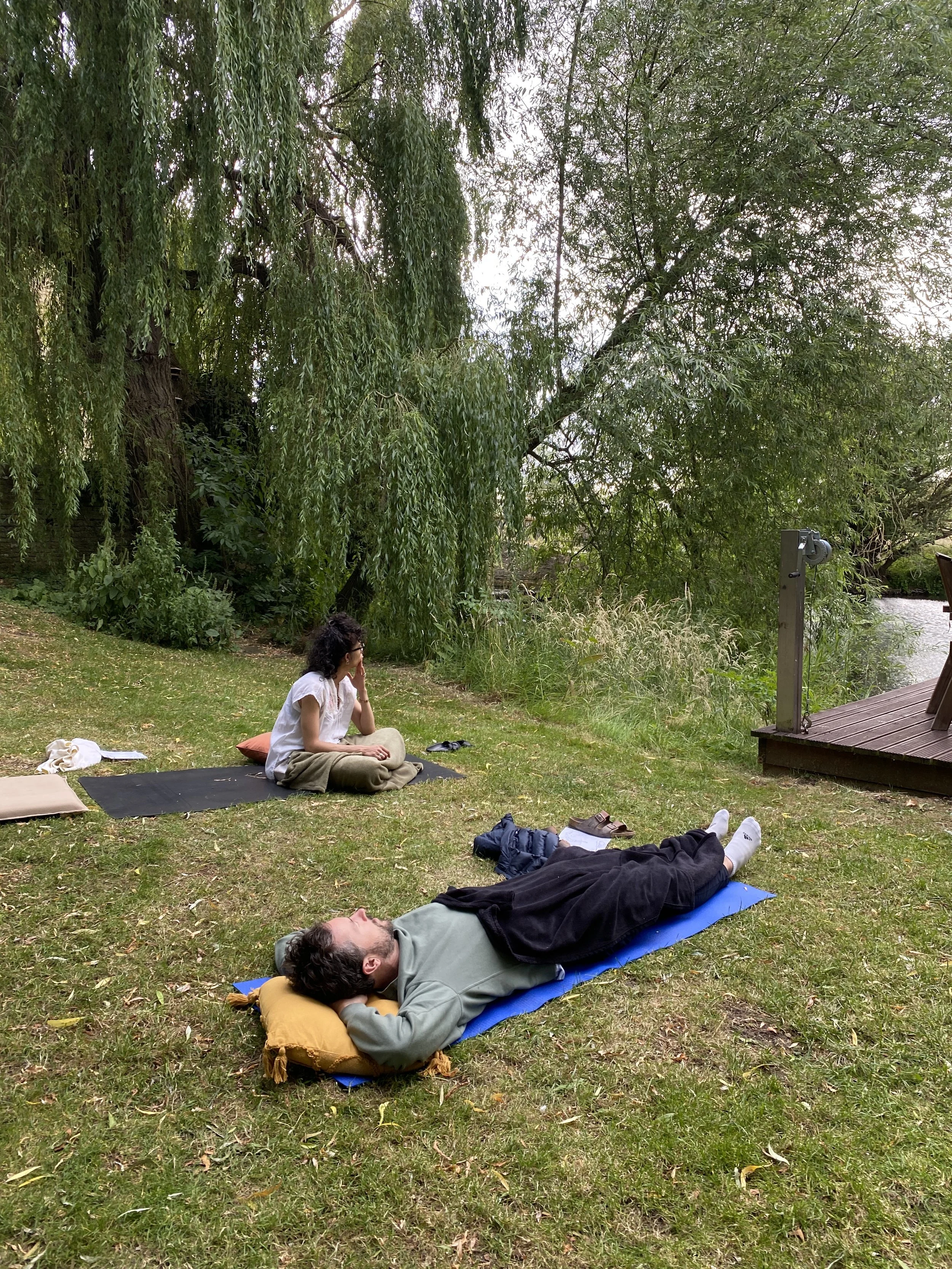 Meditations by the river which flows through the property, and rounding on the pontoon over the water, under the sweeping willow trees.